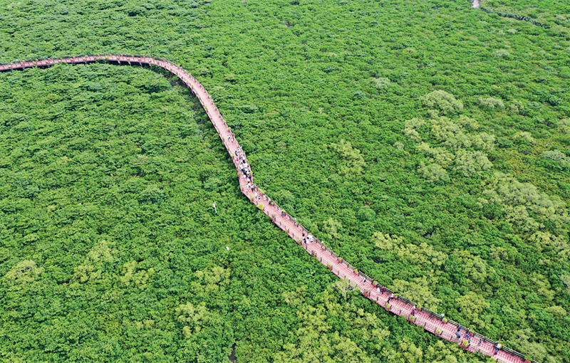 推動綠色發展,建設生态文明,重在建章立制。近年來,廣西北侖河口國家級自然保護區所在的廣西防城港市建立紅樹林精細“管、護、研”一體化工作機制,全面開展巡護管理、科研監測、宣傳教育、社區共管、生态修複等各項工作,有效推動紅樹林生态系統質量全面提升。圖爲2024年8月24日拍攝的廣西北侖河口國家級自然保護區的紅樹林。 新華社記者 陸波岸/攝